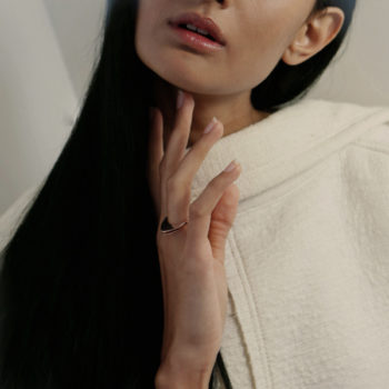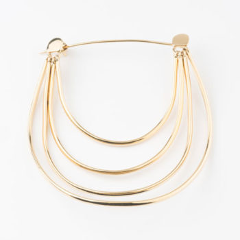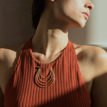 Inspired by fundamental geometric shapes from various cultures and Alexander Calder’s mobiles, Ambre sculpts the brass wire directly onto the body before gilding it with fine 24-karat gold. These sculptural pieces of jewelry highlight the silhouettes by elegantly emphasizing the movements of the body.