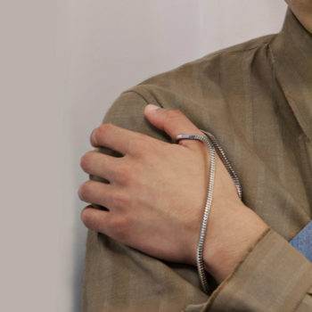 イエメンの装身具に影響を受けて作られたイヤリングは、額を経由し耳の裏にかけて着用します。首のまわりにかけてネックレスとして身に着けることもできます。